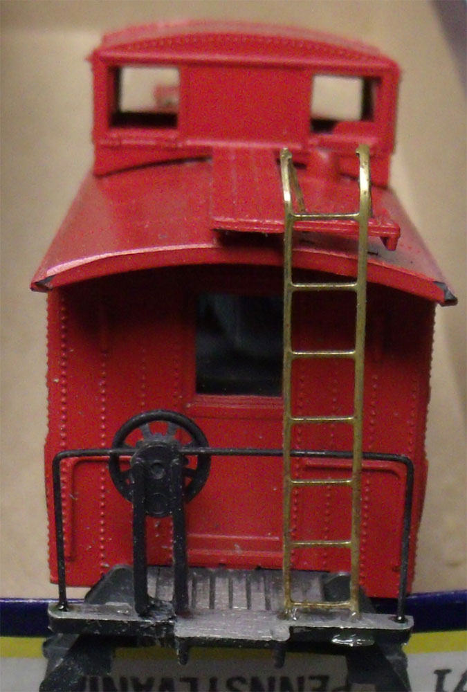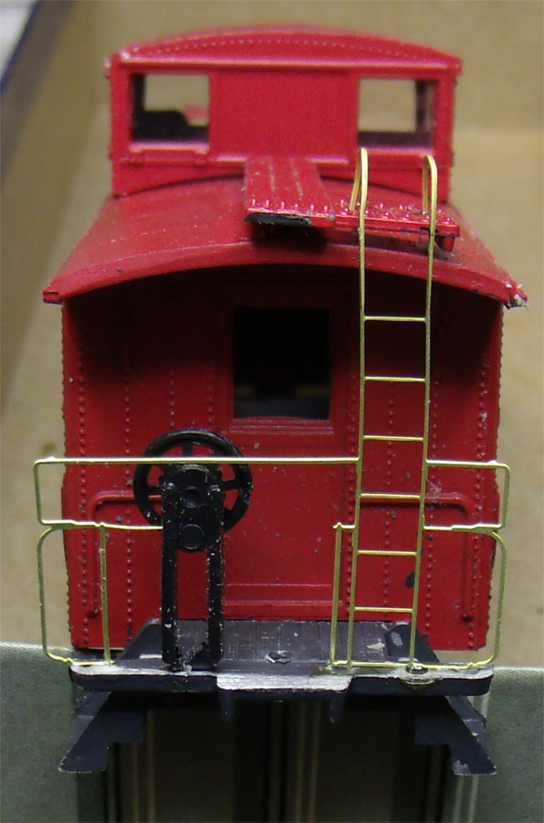 After trying to install the used brake wheel and stand, the railing needs to be between the brake wheel and stand. After installing the brass end railing, next install the brake wheel stand, next install the brake wheel with the brass railing in between. I found the Athearn caboose brake wheel and stand to work better, looks better and a little shorter.