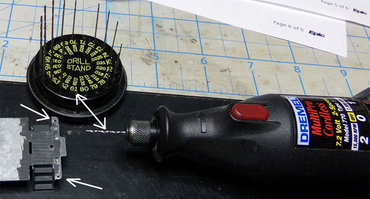 First off I noticed the 2 outside handrail holes were not located the same space from the outside edge. The photo shows the top hole being more inside. I drilled out these 2 outside holes using a #61 drill bit. I should have tried drilling a new hole but instead. I tried drilling the hole out side to side.